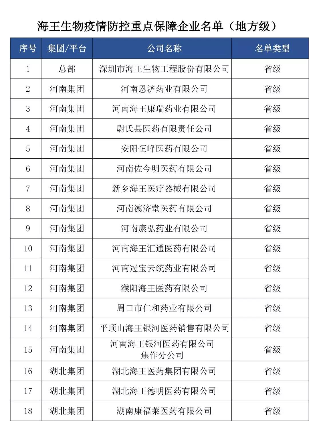 近日,全國及各地區(qū)疫情防控重點(diǎn)保障企業(yè)名單陸續(xù)公布。截至3月10日,海王生物本部入選省級“疫情防控重點(diǎn)保障企業(yè)名單”,6家子公司入選國家級“疫情防控重點(diǎn)保障企業(yè)名單”,34家子公司入選地區(qū)性“疫情防控重點(diǎn)保障企業(yè)”名單(其中省級22家,市級12家)。